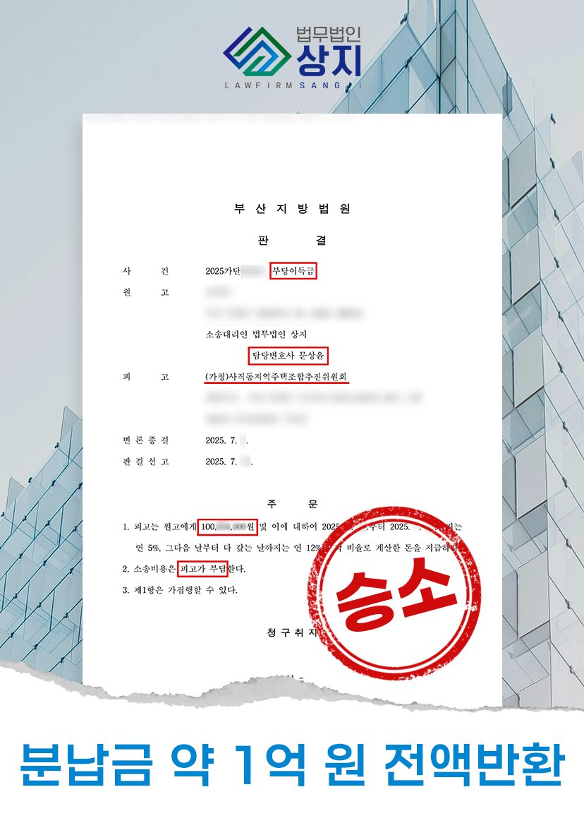About 재개발/재건축/지역주택조합 부산 사직동지역주택조합 탈퇴 2025년 7월 사례 (분담금 1억 원 전액 환급) 사직동 144-1번지 일원의 아파트 사업을 추진하는 (가칭) 지역주택조합에 가입하신 의뢰인께서,업무대행비 포함 약 1억 원을 납부하신 뒤 전액 환급 가능 여부에 대해 도움을 요청하셨습니다. 부산 송도센텀지역주택조합 탈퇴 2025년 6월 사례 (분담금 9천만 원 전액 환급) 여러 사유로 탈퇴 필요성을 느낀 A씨는 법무법인 상지에 탈퇴 절차와 환급 가능성에 대해 상담을 요청했습니다. A씨가 조합에 납부한 금액은 약 90,000,000원이었습니다. 상담 결과, 기 납부 금액의 전액 반환을 목표로 법적 대응을 준비했습니다. Get In Touch